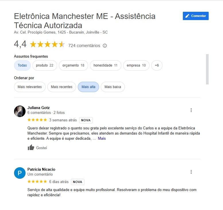 Há quase 20 anos, a Eletrônica Manchester Assistência Técnica Especializada em Joinville, Santa Catarina, realiza o conserto de eletrônicos de todas as marcas e informática. Nosso corpo técnico conta com Engenheiro Eletrônico Pós-Graduado em manutenção, assegurando a máxima qualidade no conserto de eletrônicos. CREA-SC 150309-3. Trabalhamos com manutenção de produtos eletrônicos e manutenção em placas de máquinas industriais.